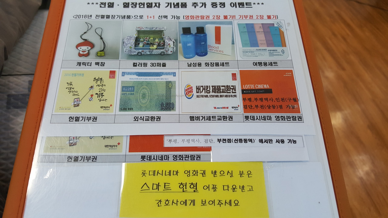 부천 상동 헌혈의집에서는 헌혈하는 분들에게 다양한 혜택과 보상을 제공합니다. 저 또한 전혈을 하고 나서 2016년 달력과 나누미 백참 캐릭터를 받았습니다. 이외에도 헌혈자들을 위한 특별한 이벤트가 있어 매번 방문할 때마다 새로운 경험을 할 수 있습니다.
