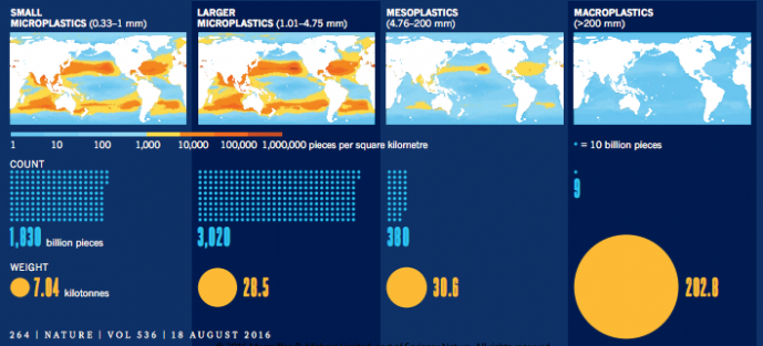 이러한 미세 플라스틱은 바다 생물들이 먹이로 착각하여 섭식하고 있다. 2015년 일본 도쿄만에서 잡은 멸치 64마리 중 49마리의 몸속에서 미세 플라스틱이 발견되었던 사례가 있다. 최근 IUCN이 발표한 보고서에 따르면 매년 바다에 버려지는 플라스틱 쓰레기 중 약 15~31%가 미세 플라스틱 쓰레기라고 한다.
