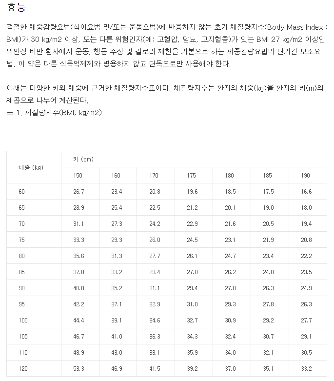 - 효능: 외인성 비만 환자의 단기간 체중감량 보조요법