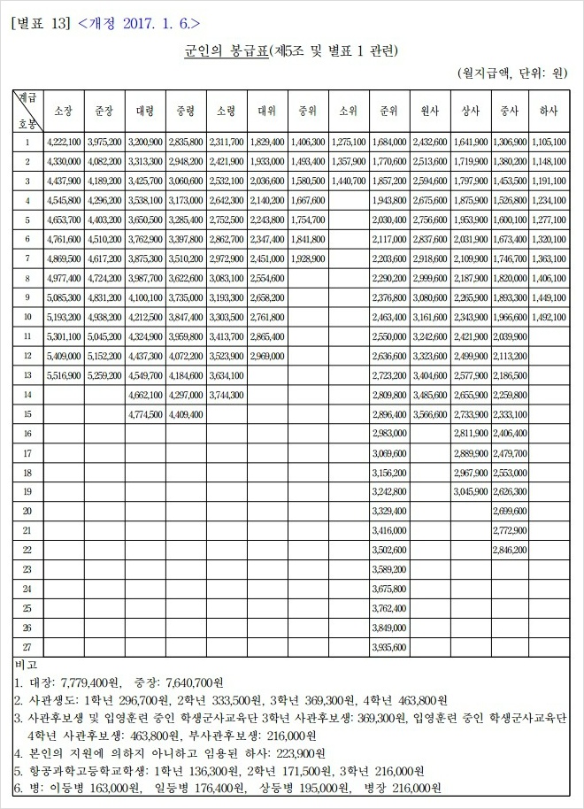2018년 군인 봉급표