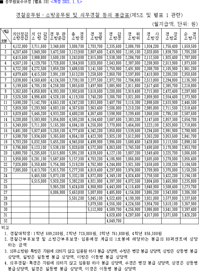 2021년 소방공무원 봉급표 경찰 공무원 봉급표