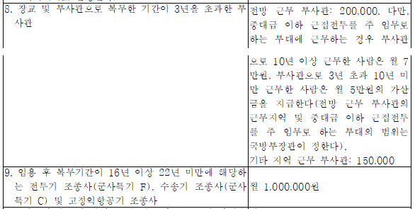 참고로 회전익 항공기 조종사인 육군항공준사관이나 장교들은 15년 이상 복무시 지급되는 조종사의 군인장려수당 100만원을 받진 못한다.